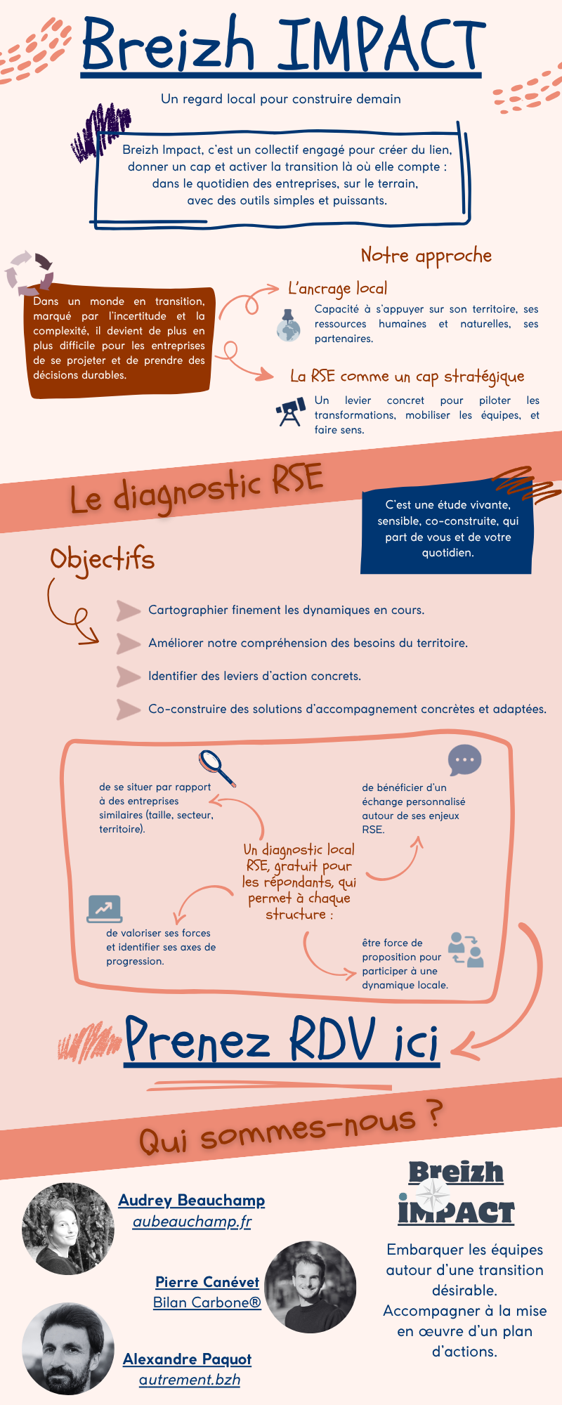 Avec plusieurs acteurs de la transition locale, nous avons monté le collectif : Breizh Impact. Ensemble nous lançons un diagnostic RSE local, gratuit pour les répondants, afin de :